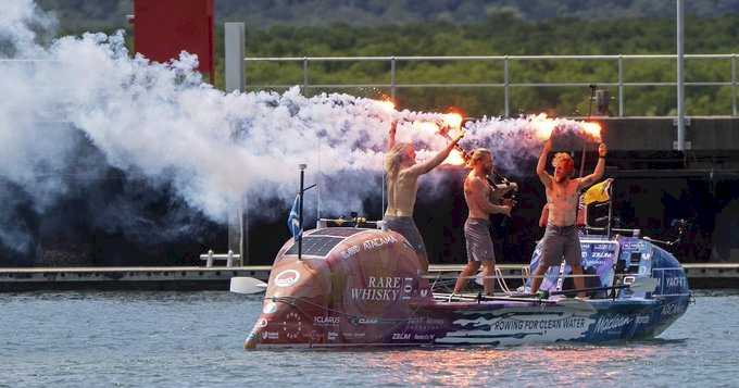 The trio from Edinburgh endured seasickness, injuries and violent storms, including one that swept Lachlan overboard, while raising over 700,000 pounds ($945,690) toward a 1 million-pound ($1.3 million) target for clean water projects.